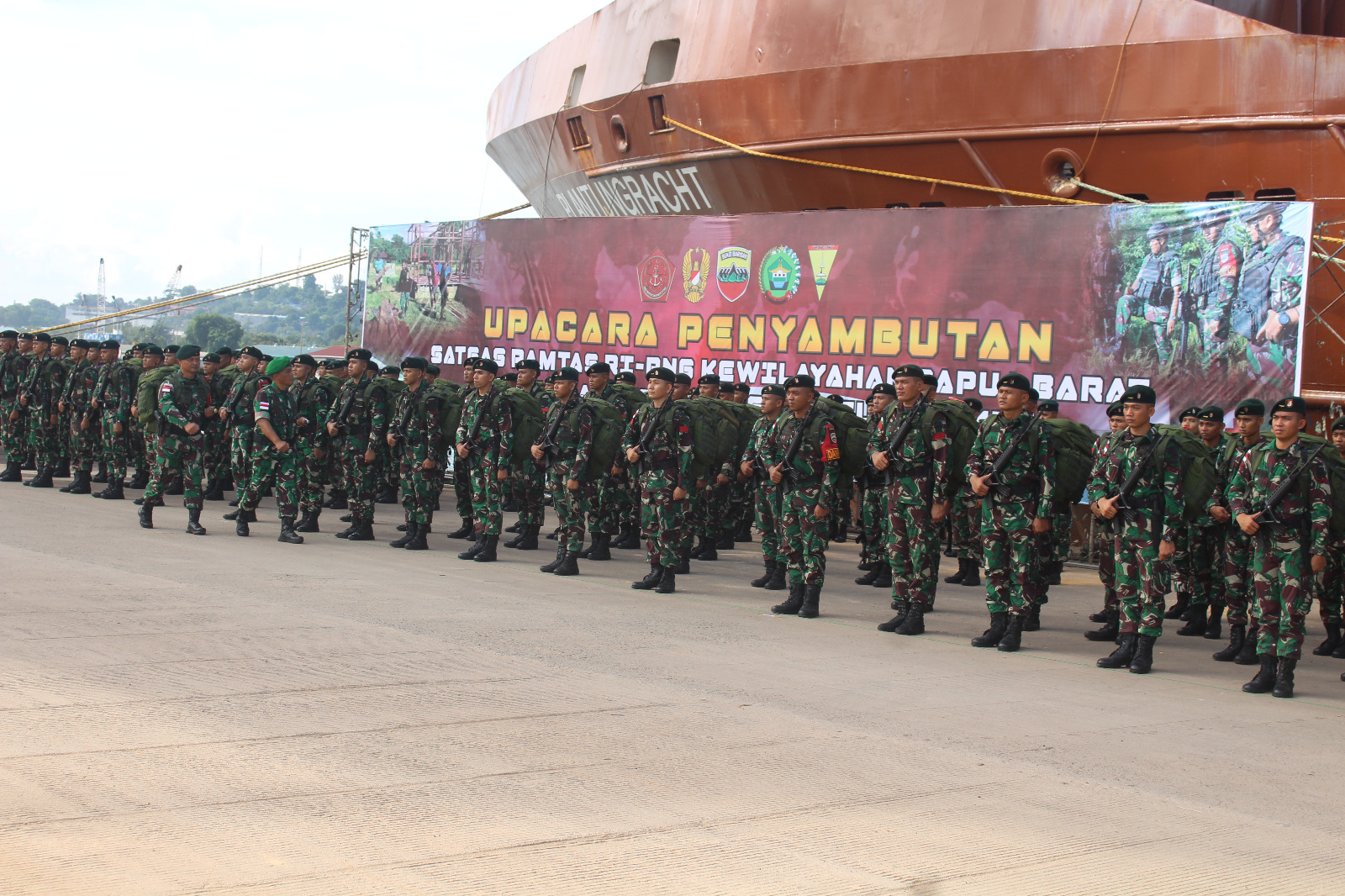 BATAM – Korem 033/WP menggelar upacara penyambutan atas kedatangan prajurit Satuan Tugas (Satgas) Yonif Raider Khusus 136/Tuah Sakti yang baru saja selesai menjalani tugas melaksanakan operasi pengamanan di perbatasan Papua selama 14 bulan.