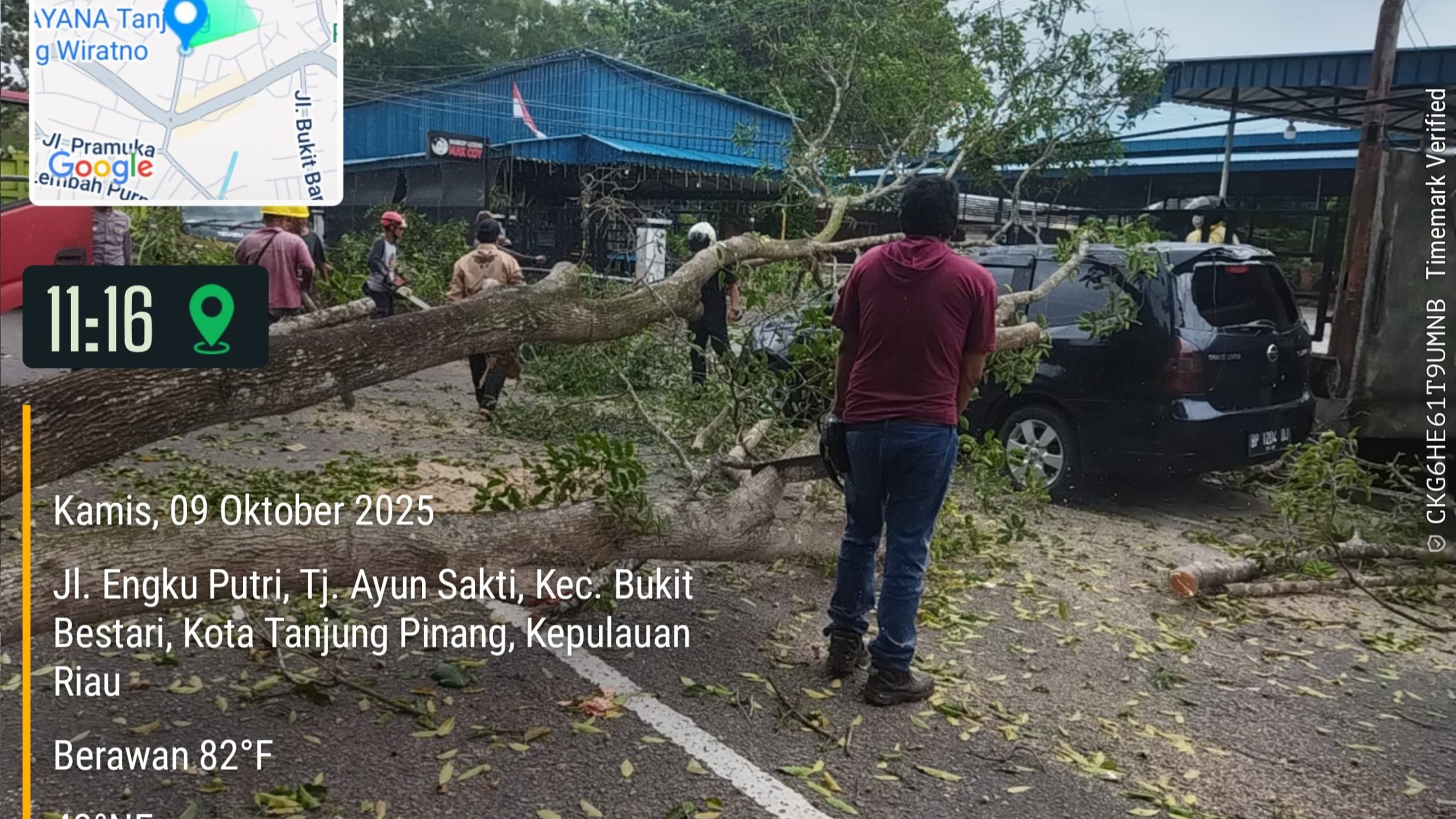 Meski tidak menimbulkan korban jiwa, satu unit mobil Nissan Grand Livina berwarna hitam yang sedang terparkir di Jalan Engku Putri mengalami kerusakan cukup parah setelah tertimpa pohon.