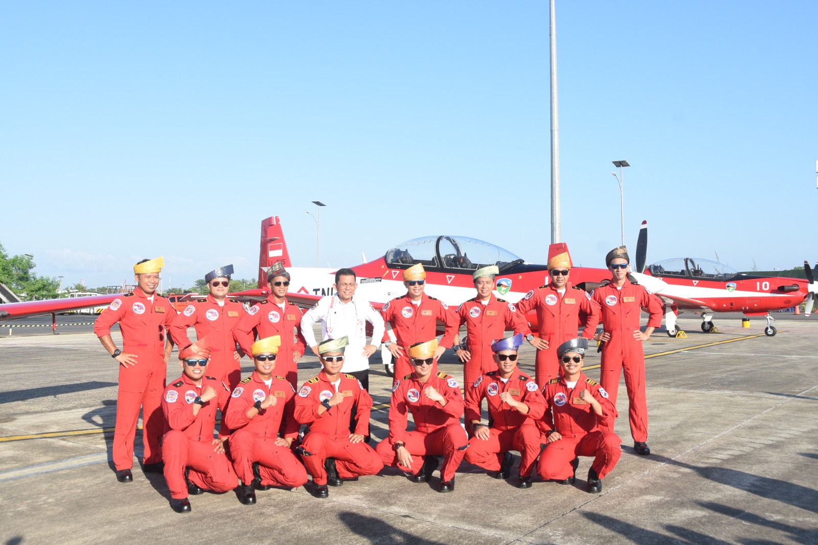 Menanggapi hal tersebut, Gubernur juga memberikan dan memasangkan Tanjak kehormatan kepada seluruh anggota “The Jupiters” dan dilanjutkan berfoto bersama dengan latar pesawat berjenis KT – 1B Wong Bee Jupiter Aerobatic Team TNI Angkatan Udara.